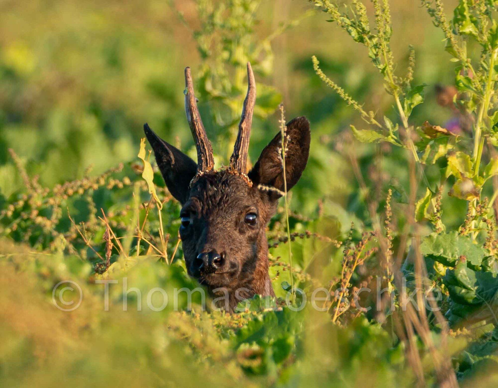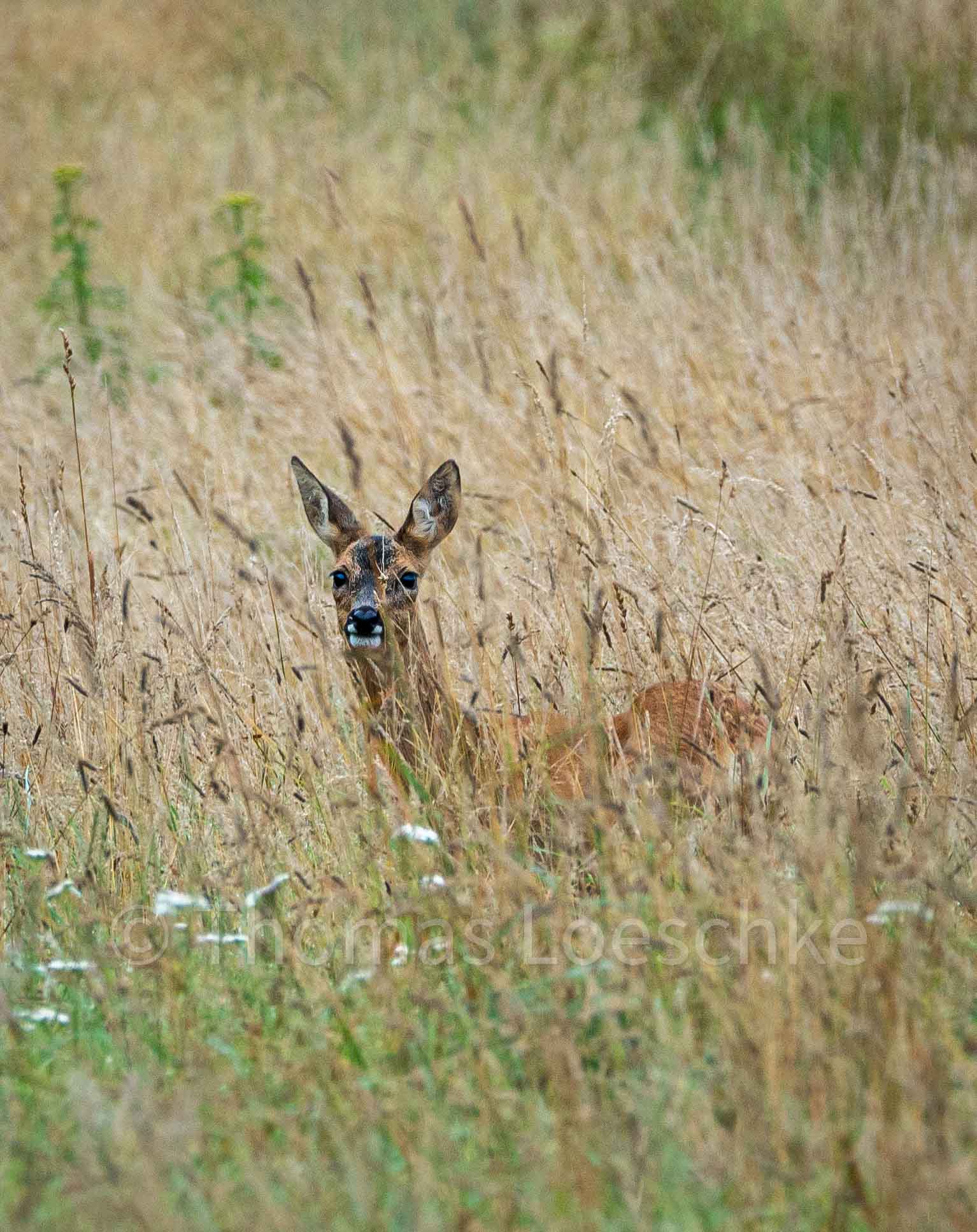 Im Sommer steht das Rehwild oft im hohen Getreide oder in den Zuckerrüben. Hoher Bewuchs oder Sträucher am Waldrand geben dem Rehwild Deckung. Das Reh fühlt sich verborgen und das gibt dem Fotografen die Chance nah heran zu kommen und schöne Rehportraits zu schiessen.