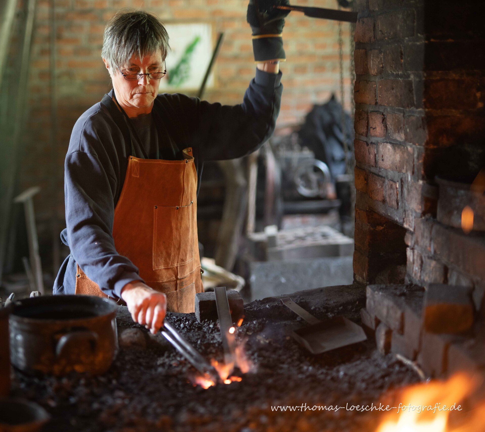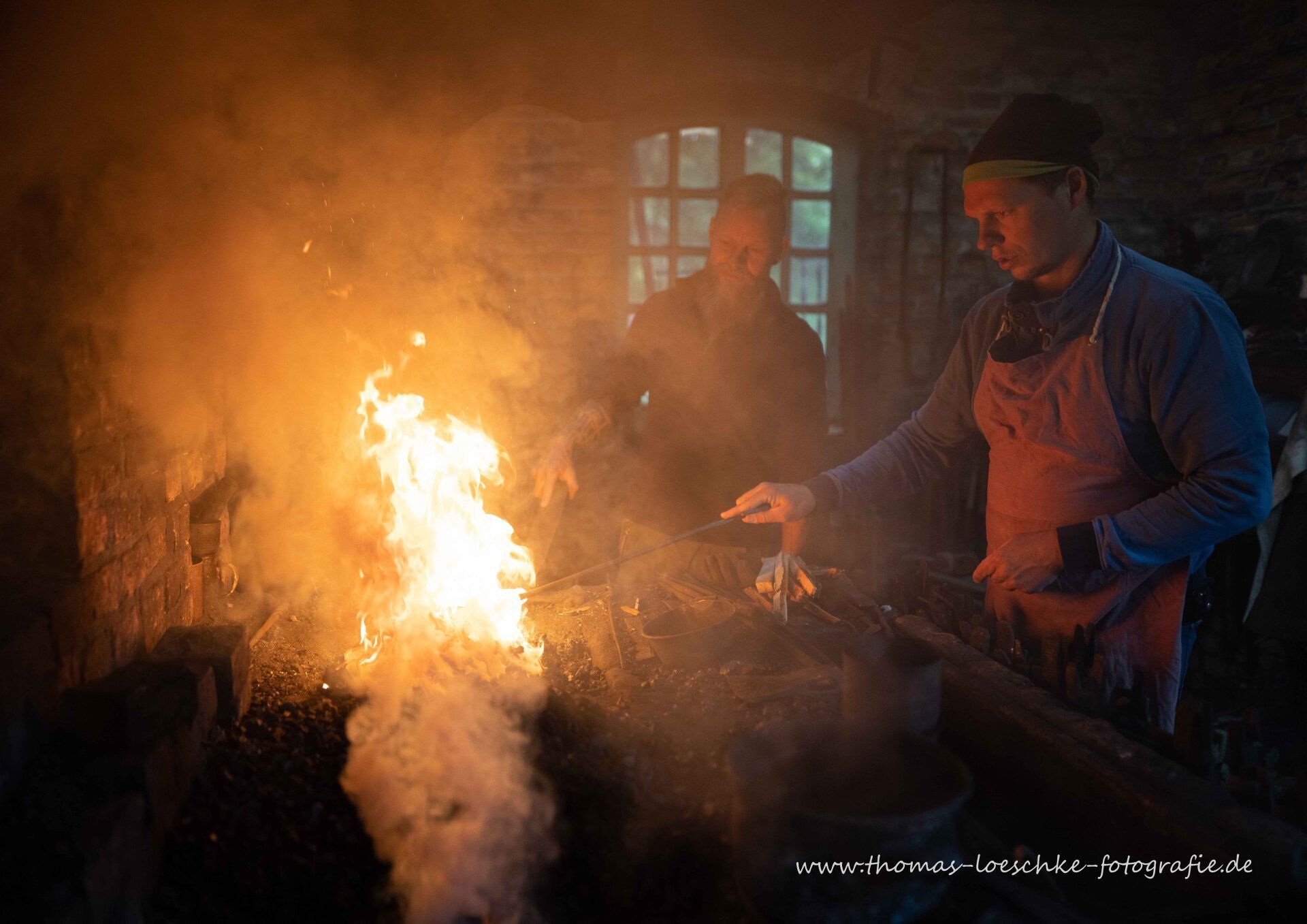 Wer Schmieden will, musst das Feuer mit den großen Blasebälgen von Hand aufheizen!